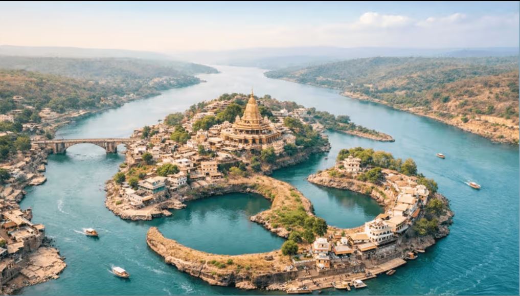 The temple is situated on Mandhata Island in the middle of the holy Narmada River in the Khandwa district of Madhya Pradesh. The island is approximately 4 km long and is surrounded by scenic hills and river views.