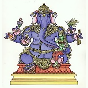 The blue colored Ucchishta Ganapati is also known as the Lord of Blessed Offerings, and he is also considered the protector and guardian of culture. He has 6 arms, in which he holds a veena, a pomegranate, a japa mala, a blue lotus flower, and a sprig of fresh paddy. On his lap sits his Shakti, his consort.