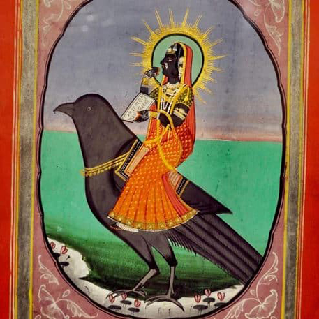 The state of widowhood in Indian society carries a range of complexities. Conventionally widowhood is an unenviable state. Without her husband, a widow has lost her former social standing and may come to be viewed as a financial burden on the extended family. This is symbolized by the cart in which Dhumavati sits; it has nothing to pull it. Occasionally an illustration shows two birds yoked to the cart, but far from expressing empowerment, they appear to be struggling against something too big and to heavy to pull.